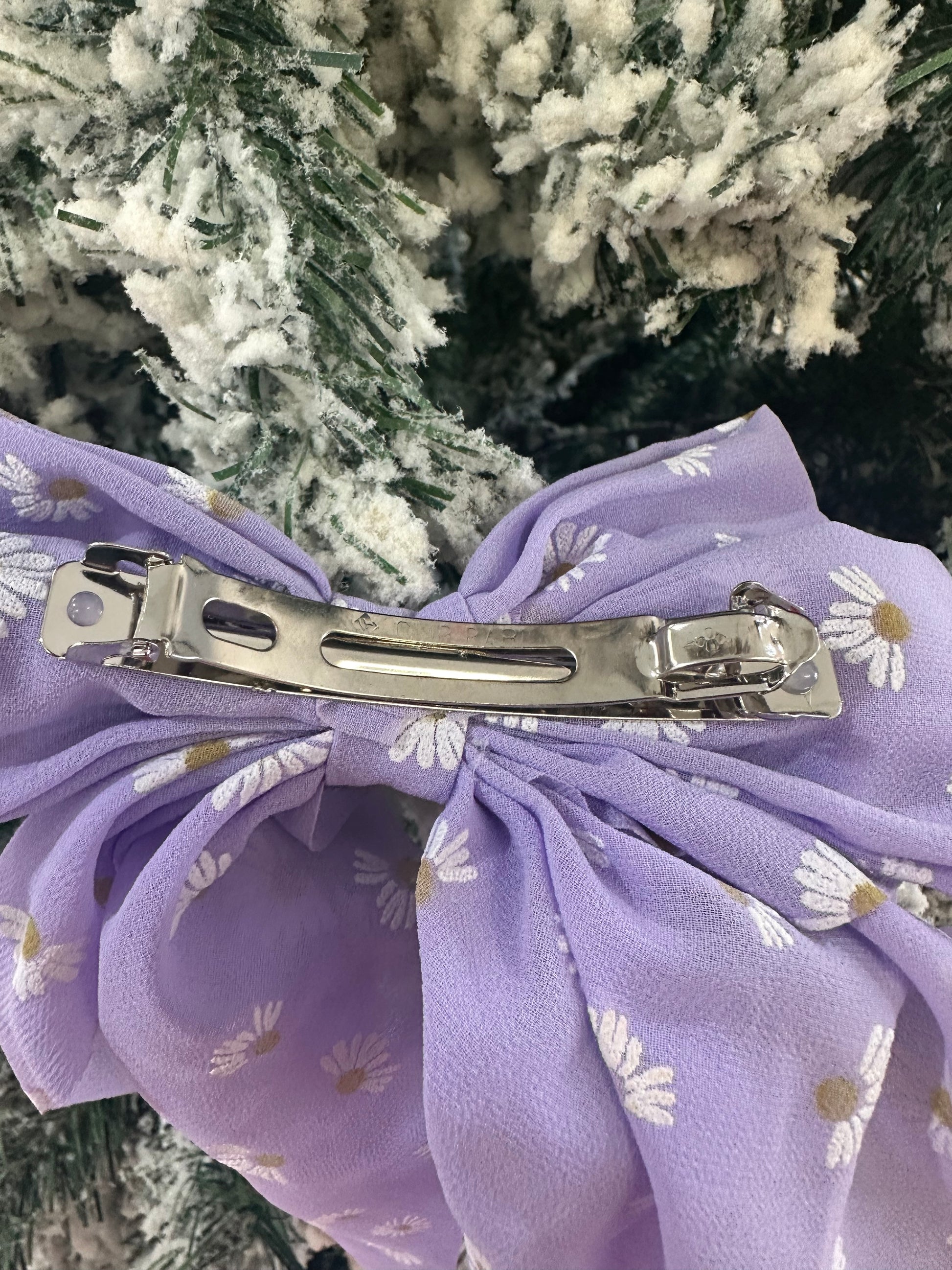 Sweet Daisy printed, sheer organza bows with large tails in assorted colours on a French barretta clip