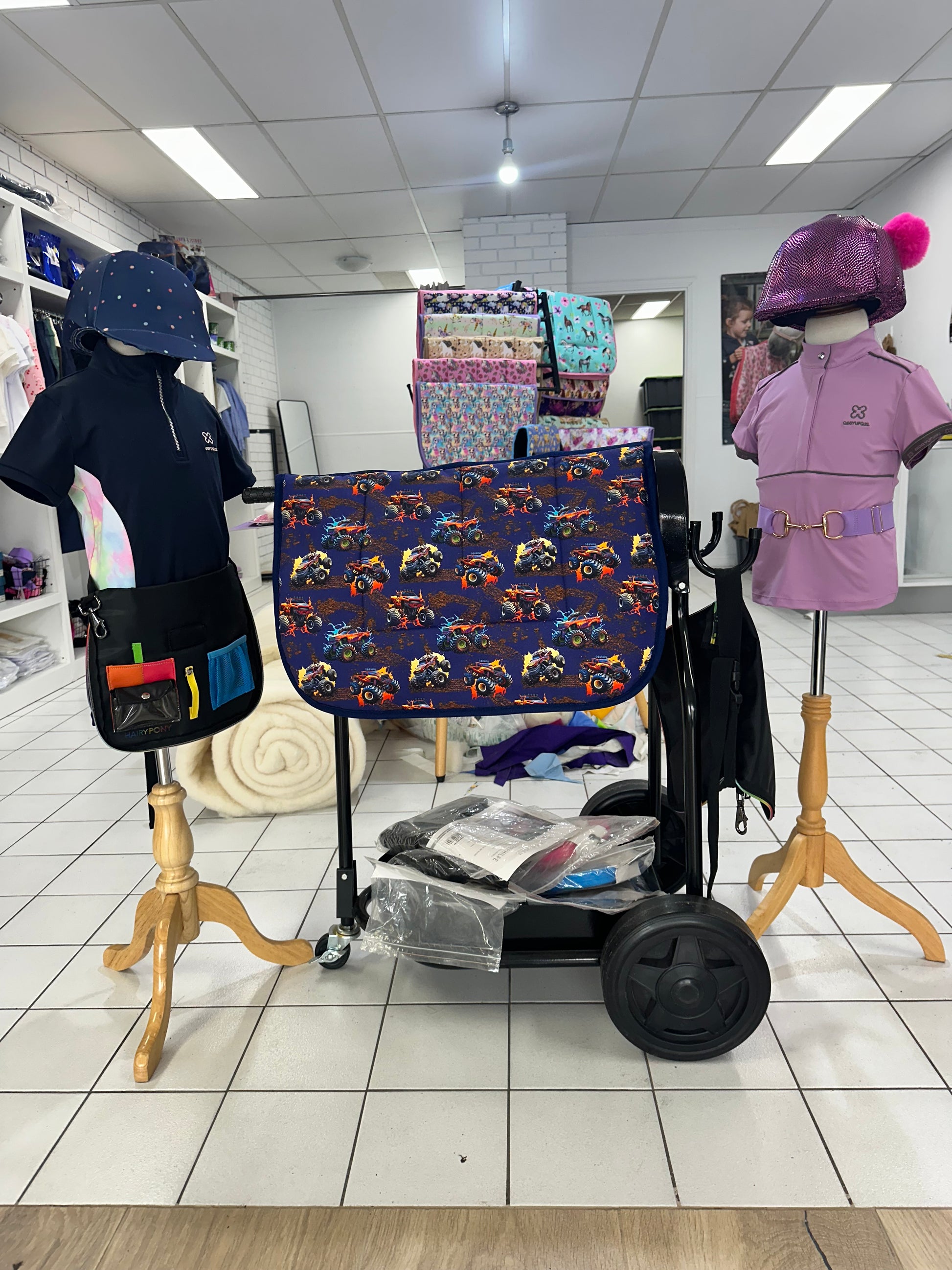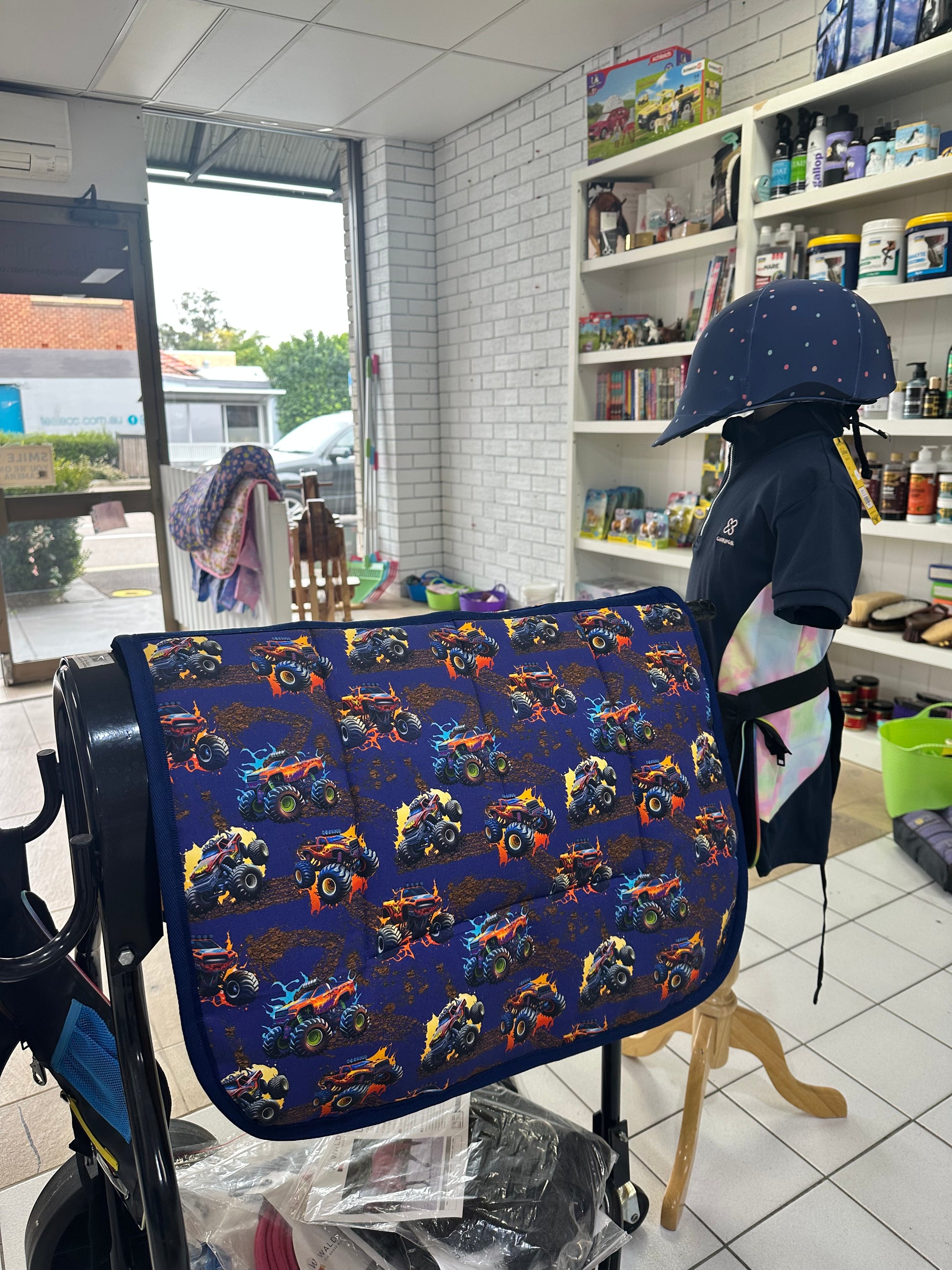 Monster truck madness is brought to life on this navy blue saddle pad covered in bright mud flinging monster trucks