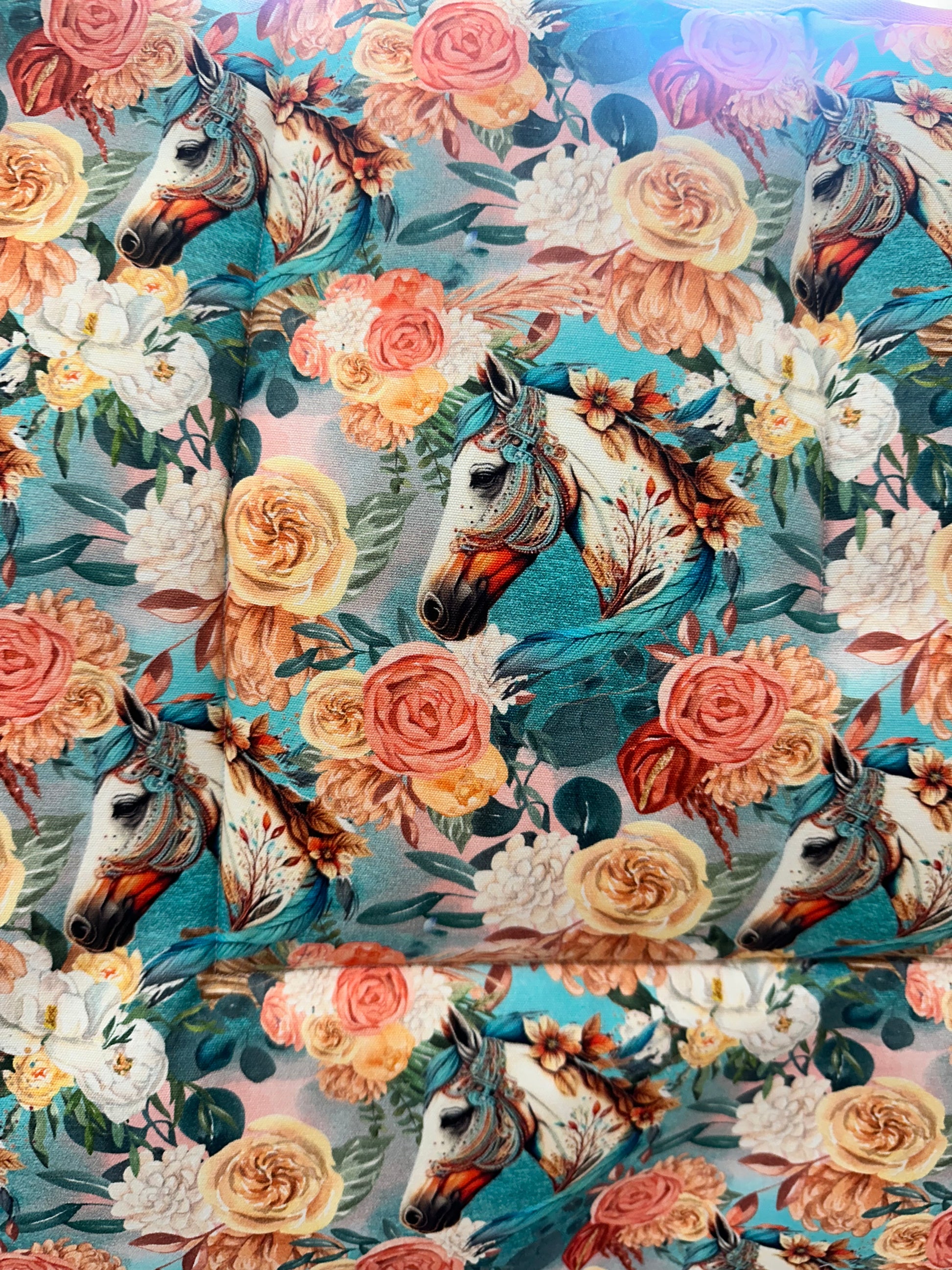 Apricot, coral, turquoise and soft pink make a stunning combination featured on our handmade saddle pad. Bound in pink and featuring beautifully drawn war horses this one is not to be missed and the fabric is limited so be quick and secure yours before there’s none left!