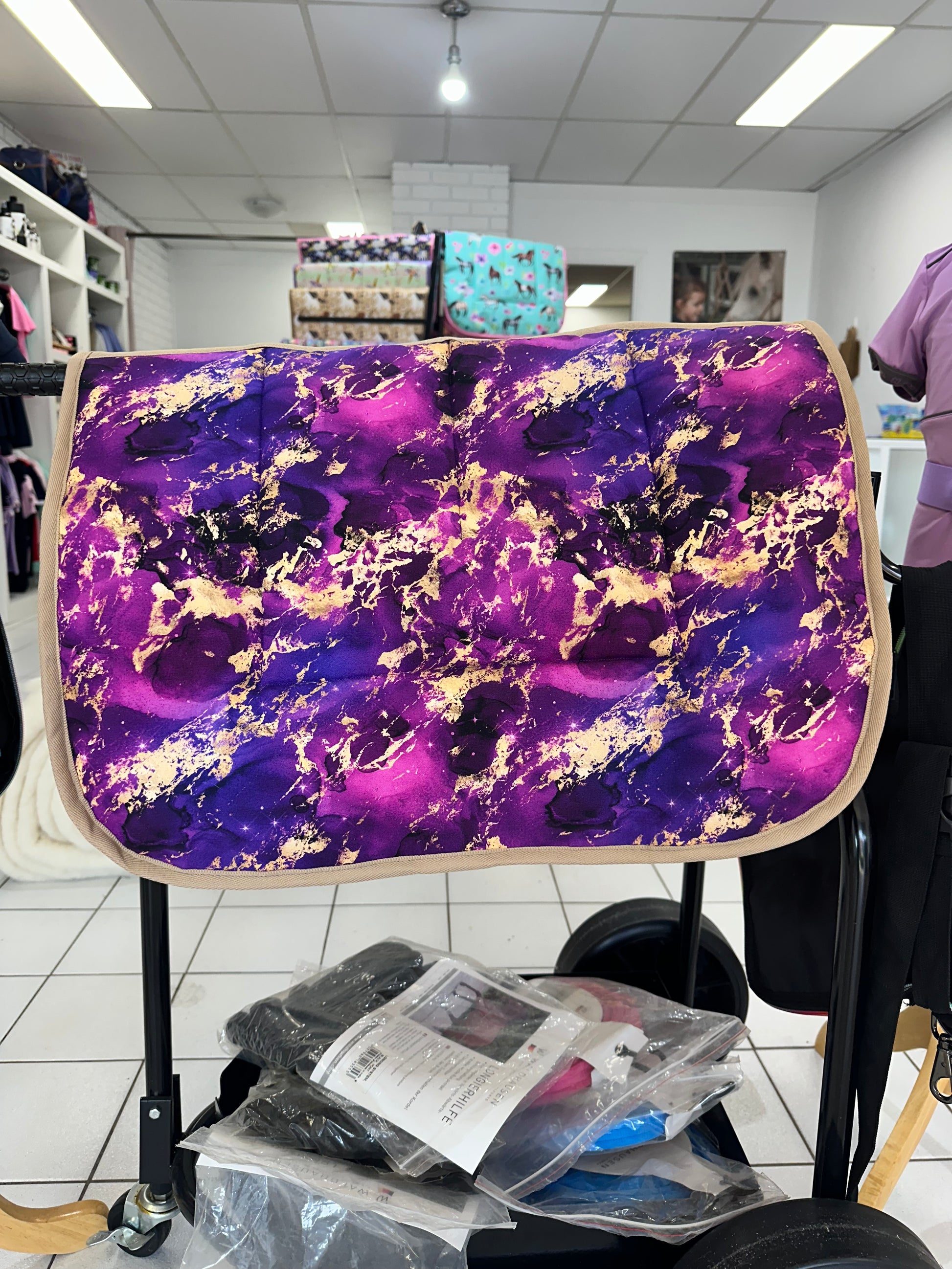 Stunning metallic gold splashed across a deep purple oil spill base this saddle pad will delight any lover of purple