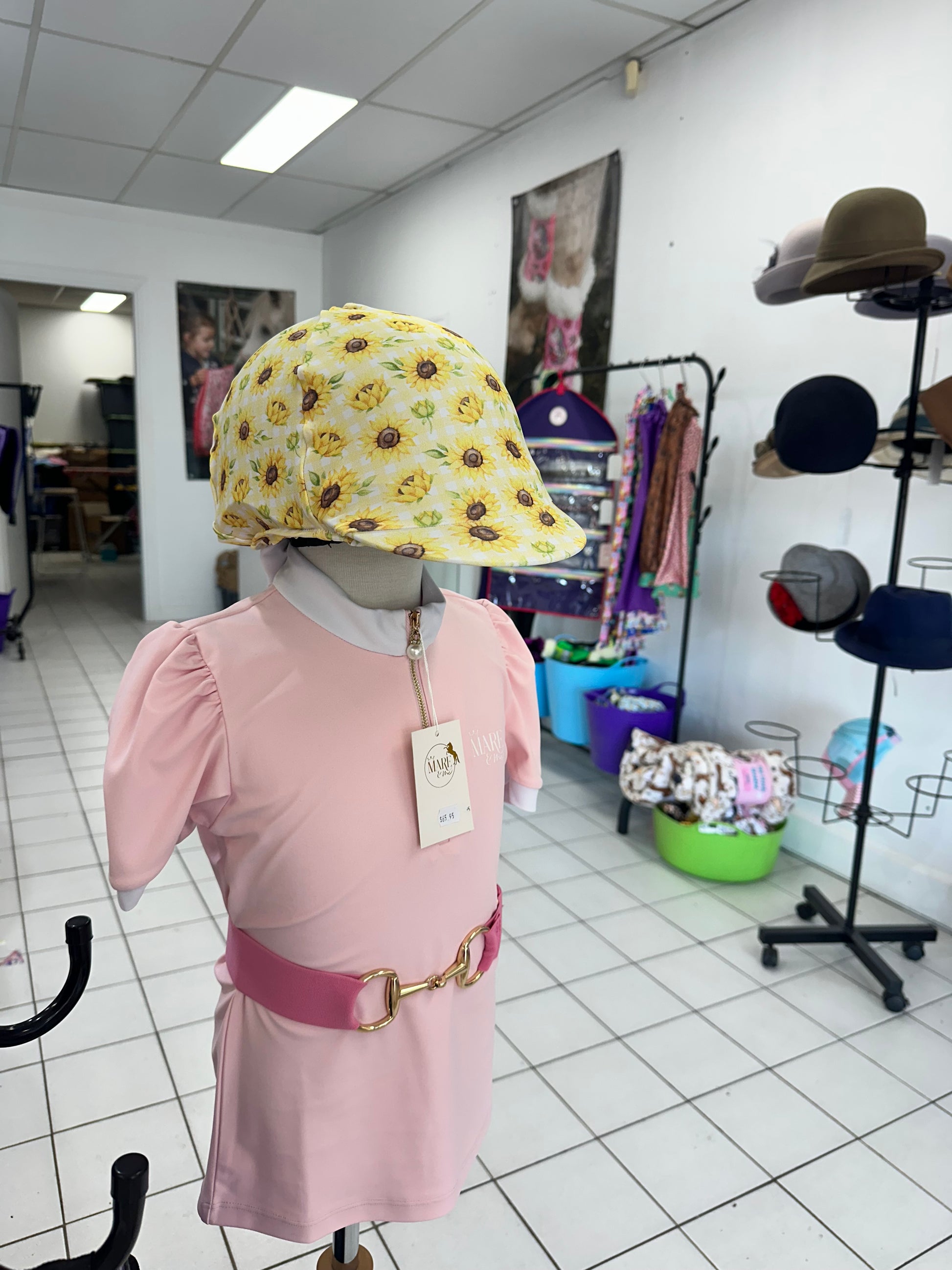 Bright and cheerful this sunflower spattered gingham print helmet cover is sure to delight. NEW from our print on demand range this is sure to become a popular choice. Add a Pom Pom or two to cart for additional cuteness!