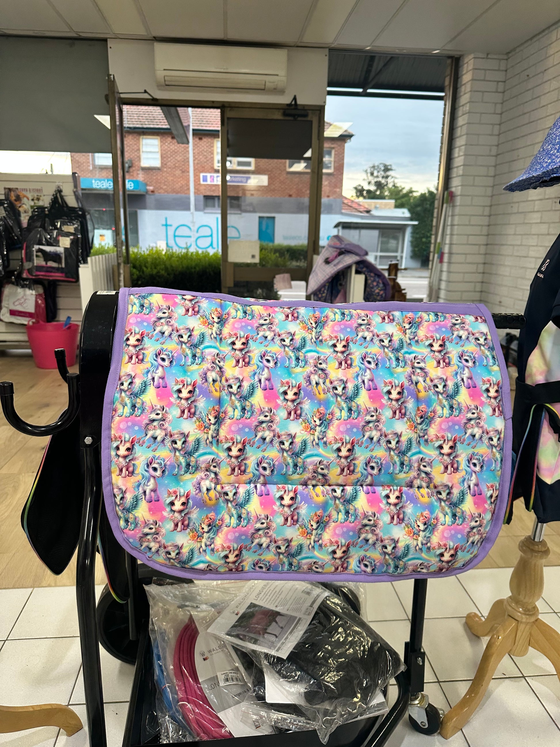 Designed in various fun prints and sizes, these handmade saddle pads are perfect for any equestrian discipline. Our all purpose shaped saddle pads with rectangle quilting add personality and joy to every ride.
